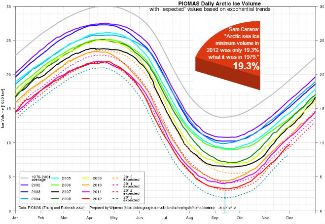 The urgency to act is perhaps best expressed by means of the two images below, which can constitute a fitting end-of-year message if you like to share them further. The image below highlights that Arctic sea ice minimum volume in 2012 was only 19.3% what it was in 1979. The background image, prepared by Wipneus, shows an exponential trend projecting a 2013 minimum of only 2000 cubic km of sea ice, with a margin of error that allows Arctic sea ice to disappear altogether next year, i.e. nine months from now.