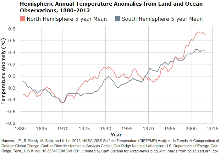 The image below shows sea surface temperature anomalies up to 1.5 degrees Celsius over the May-June 2014 period, with global average anomalies that hover just above 1 degree Celsius.